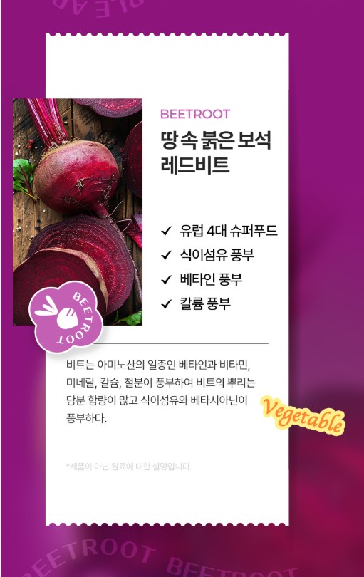 - 맛있는 ABC 클렌즈: 기존의 디톡스 음료들이 마시기 힘들었다면 걱정 마세요. 흙 맛 없이 상큼하고 달콤한 ABC(사과, 비트, 당근) 레시피로 누구나 맛있게 섭취할 수 있습니다.