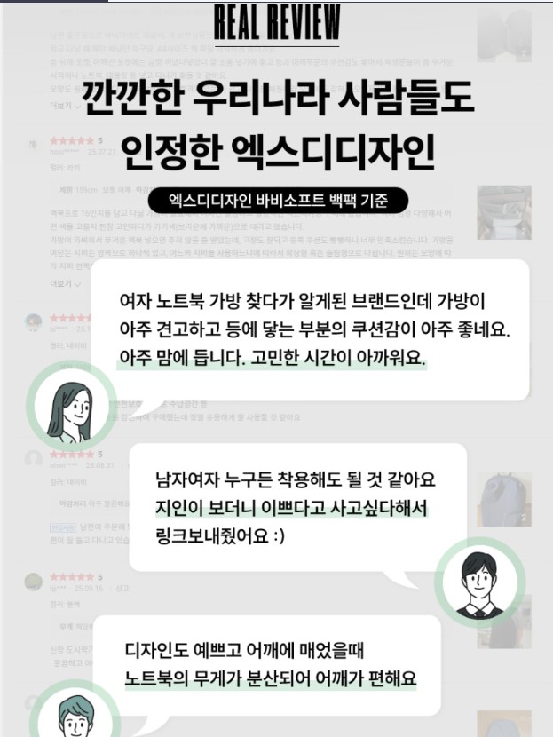 엑스디디자인 바비소프트는 디자인, 수납력, 안전성이라는 세 마리 토끼를 모두 잡은 제품입니다. 수많은 백팩 중에서도 사용자의 편의를 이토록 세심하게 배려한 제품은 흔치 않았습니다. 실사용자들의 높은 평점(4.83/5)이 이를 증명하고 있죠. 튼튼하면서도 예쁜 노트북 가방을 찾고 계신다면, 고민은 배송만 늦출 뿐입니다!