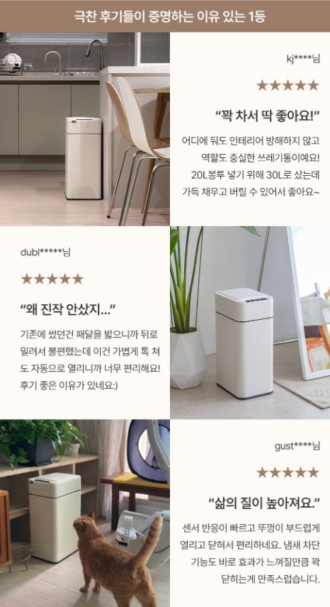 시중의 저가형 센서 쓰레기통은 센서 오작동이 잦거나 배터리 소모가 심한 경우가 많습니다. 하지만 이 제품은 검증된 리뷰와 실사용자들의 긍정적인 평가가 증명하듯 완성도가 매우 높습니다.