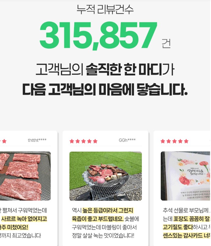 "부모님 선물로 드렸는데 고기 질이 너무 좋다고 칭찬받았다", "캠핑 가서 구워 먹었는데 입에서 살살 녹는다"는 후기가 줄을 잇고 있습니다. 저 역시 여러 브랜드의 한우를 비교해 보았지만, 고기 빛깔과 신선도 면에서 엄마네한우는 확실히 차별화된 퀄리티를 보여줍니다.