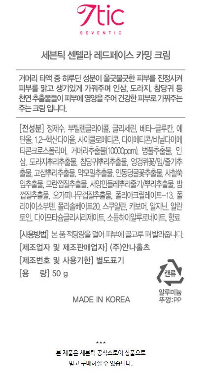 세븐틱 센텔라 레드페이스 카밍 크림, 붉은피부크림, 거머리크림, 영양크림, 재생크림 실핏줄크