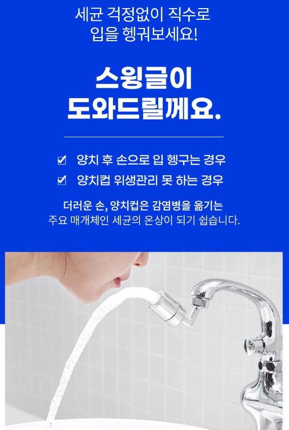 이 제품의 가장 큰 장점은 바로 360도 자유로운 회전이 가능하다는 점입니다. 기존 수전은 물줄기가 고정되어 있어 아이를 안고 물 쪽으로 다가가야 했지만, 스윙글 워터탭은 물줄기를 아이 쪽으로 직접 조절할 수 있어 정말 편해요. 특히 기저귀를 떼기 전 아기 비데용으로 사용할 때 그 진가를 발휘합니다. 양치 후 입을 헹굴 때도 손을 사용하지 않고 물줄기를 위로 올려 바로 헹굴 수 있어 위생적이고 편리하더라고요.