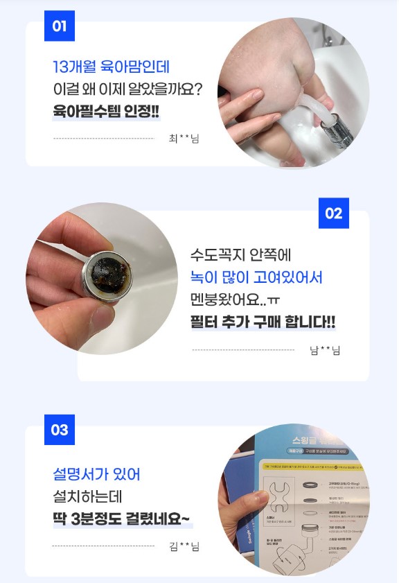 세면대 높이가 낮아 고생하시는 분, 아기 비데가 필요하신 분, 오래된 아파트라 녹물이 걱정되시는 분들께 미소랩 스윙글 워터탭을 강력 추천합니다. 꼼꼼하게 따져보고 선택한 만큼 실생활에서의 만족도가 정말 높네요.